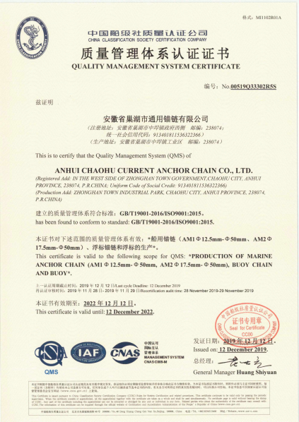 安徽省巢湖市通用錨鏈有限公司質量管理體系認證證書